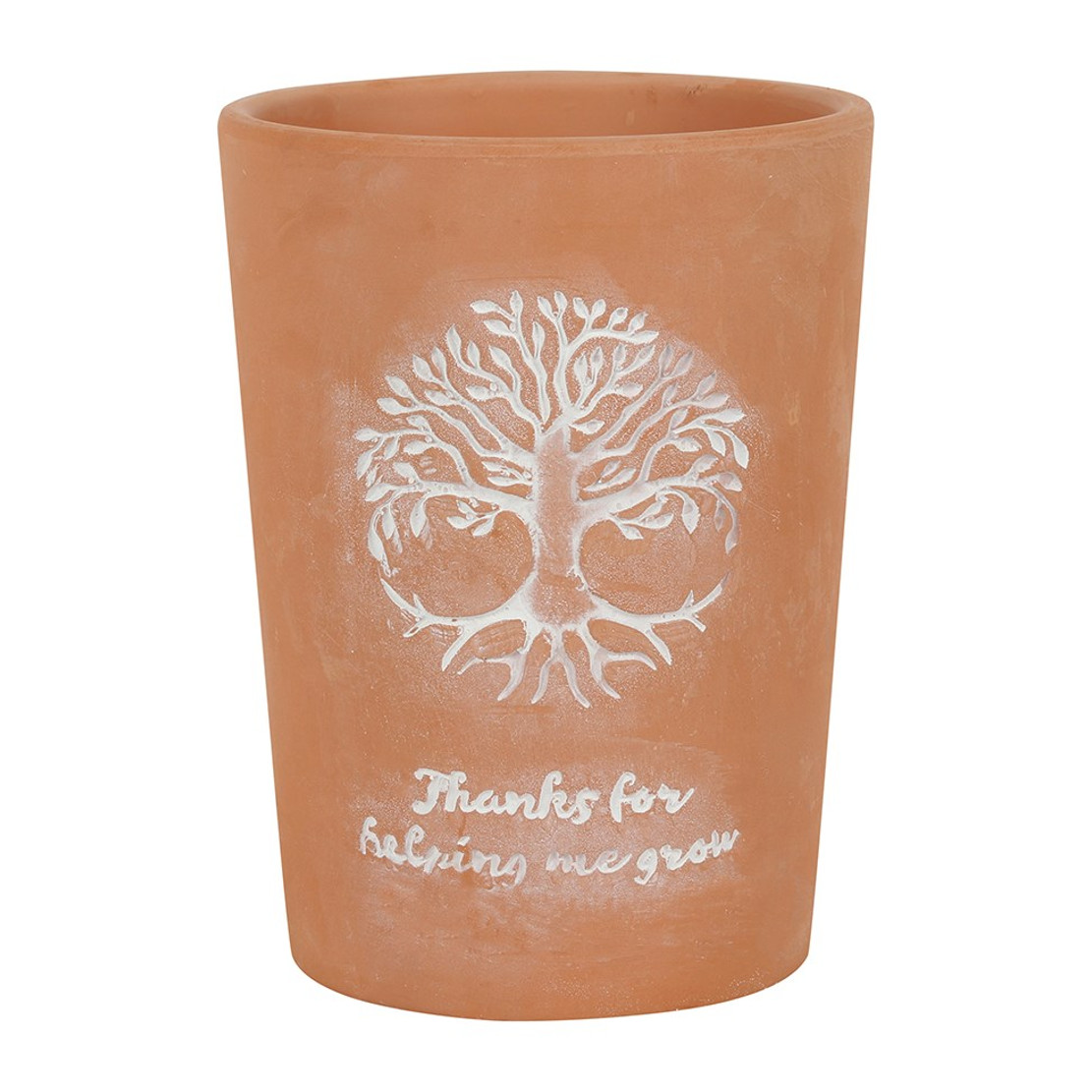 This terracotta plant pot features a stunning Tree of Life design and ‘Thanks for helping me grow’ caption accented by a white-washed finish. Makes a sweet and meaningful gift for teachers and Mother’s Day.