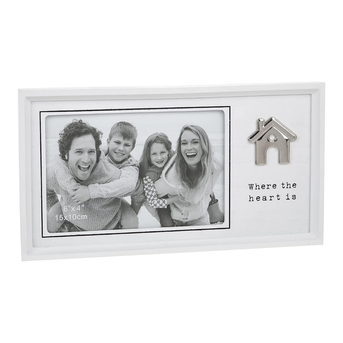 A stylish clean and beautiful white photo frame with the message “Where the heart is” that takes a 6×4 Photo.